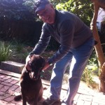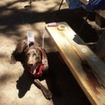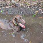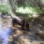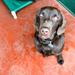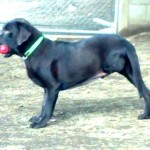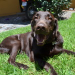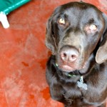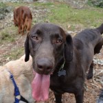 Moose is a young (1 -1 1/2 year old) chocolate lab. He was a working dog, apparently sniffing termites for his owner who ran a pest control company.