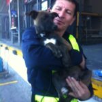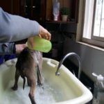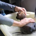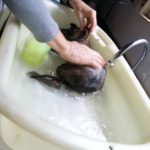 The puppy was paralyzed with fear, and his rescuers were able to throw a towel over him and scoop him into Snicker’s crate. He passed the night with Jihae, unmoving and pressed into the back of his crate. In the morning we went over and picked him up.