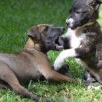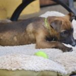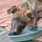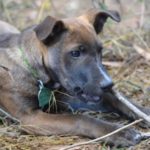 We estimate that he was between two and a half and three months old on intake. Choco was feral, and froze or snapped if we tried to handle him. We did the minimum handling necessary and pretty much left him alone for several days. He would not eat at all for two days, even when the most delicious food was left in his crate. Finally, we started to force feed him a meat gruel. After about 3 days he began to venture out of his crate and started looking around. He was interested in the other dogs, but clearly terrified of humans. If he caught sight of us he ran and hid in his crate.