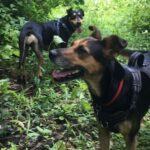 They were fostered together for several months and their fosters reported that they are calm, quiet, sweet and easy going. They are fully house trained and have no issues in the home. They walk well on leash and do fine off leash in the woods.