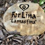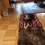 Lina would do well with older children. She would do best in a home without cats, but she loves other dogs and could live happily with a dog buddy. We don’t know her full story, but we think that Lina was kept outside in some kind of auto shop (from the black grease on her). She certainly had never been allowed inside a home or a building, and was terrified when we brought her inside. After living with her foster family and after lots of training with us, she is much better, and will generally come inside when invited. She continues to be leery of some flooring materials and needs to be coaxed in with targeting, patience, and positive reinforcement.