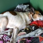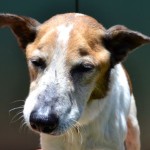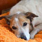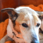 We agreed to take them, and Mindy arrived with a male named Chakra. Both dogs had apparently been at this site since 2002. Mindy has thick cataracts and can barely see shadows, she was terribly thin, her face covered with infected dog bites and her lymph glands swollen alarmingly. She was in great pain from untreated arthritis, needed a dental cleaning and extractions in the worst way. She had a severe flea infestation, and also had lice.