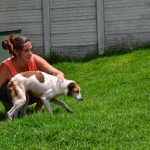 She and Chakra have been together for many years, but they don’t do well together at night. Chakra gets disoriented and stumbles onto Mindy. She startles and attacks him, causing him to panic. We have built the dogs a separate divided run with a fenced, flat grassy area as they also don’t navigate the play area all that well with its level changes.