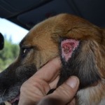 Peluche comes from Lake Atitlan in Guatemala. He was owned by an indigenous family there, who agreed to allow AYUDA (an animal welfare group) to vaccinate and neuter him. He did okay with this family until the cattle flies found his ears. They bit his ears badly and both ears were bloody, inflamed messes. AYUDA took him in again, treated his ears, and returned him. Upon a later home check, Peluche was found to be tied with a wire noose that had cut deeply into his neck, and both his neck and his ears had been ripped open by the cattle flies.