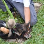 Twix and her sisters have been fostered in a couple of different homes, and are doing extremely well. They love people in general and love kids in particular. They are being clicker trained and have learned their basic behaviours of “sit”, lured “down”, a hand target, and are beginning to walk on leash. They are being crate trained as well.