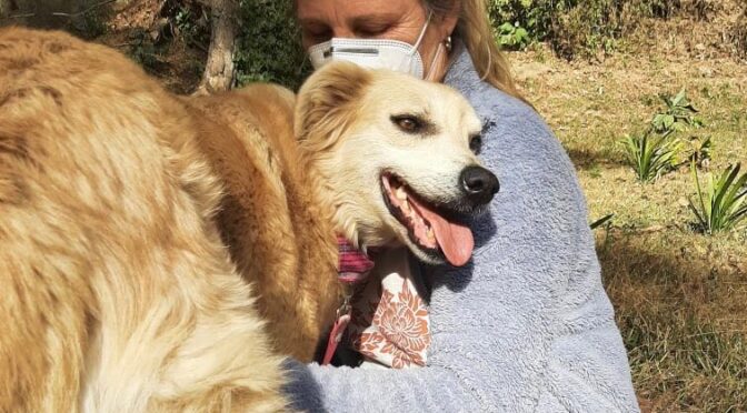 This is Winnie – this cute girl has been living in a small town on the way up to the rescue center. She appeared in the town square in late March. We passed her every day and stopped to feed her, she never looked great but was progressively getting worse.