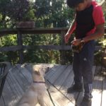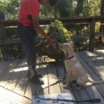 Nina has pretty clearly been mistreated by her previous people. She is very leery of strange hands reaching toward her or being picked up (although she is just fine with this from people she knows). So we are doing lots of body handling training with her and she is coming along nicely.