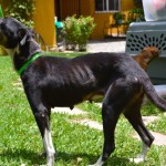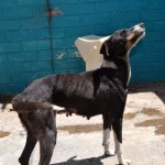 We saw Alice laying in the central park of Antigua over a period of a few days near the end of July. She was always sleeping, and was pretty obviously not well. Her coat was dry and brigttle with bare patches, she was very thin, and suffering from mastitis.