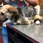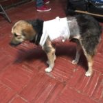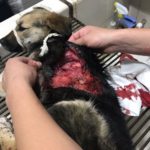 Ariel’s whole side had been torn open by the car, and she very clearly had internal injuries. She rushed the pup to our vet, who stayed open to receive her. The injuries were very serious, and he doubted she would survive. In addition to her flayed side, she had 6 broken ribs, and a punctured lung. Ariel was a fighter, and she made it through the night, and through the next, and the next. Because of the dirt in her open chest, she had drains placed un the stitch-line and was on very strong antibiotics and pain control.
