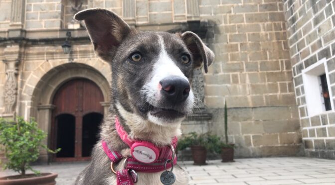 After warming up she’s sweet and cuddly and comes along well with kids and other dogs. She’s going to be medium sized.