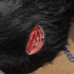 Baxter came to us via Tessa and Gerson, who rescued him in the summer. They spotted him limping along with a huge open gash along his hips. This was a machete wound-someone had chopped him open with one!