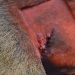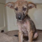 Puppy Kali was in terrible shape when we brought her in. Kali was almost hairless, scabby and infested with fleas and mange, bloated with parasites, weak and terrified, but she was too hungry to be able to resist bits of meat tossed to her. We managed to catch her and brought her home, hoping that we had gotten her in time to treat her myriad health issues.