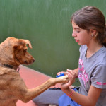 Because of this unpredictability, Carmelita is a Sanctuary Dog. She cannot be fostered or adopted due to the inherent nature of her reactivity. In a home environment with visitors, delivery people, unknown dogs, bicycles, etc. she would be an accident waiting to happen. She will live out her life with us as Queen of the Cerro. She shares a suite with Xiao Chow, and is a wonderful friend and playmate, welcoming the new arrivals and befriending them until they are adopted. She is an excellent puppy nanny, and a loving, calm dog in her controlled environment. She loves her long daily walks, her training sessions, her Kongs and chew sticks. Our gorgeous golden eyed girl does not lack for attention, and is petted and groomed and snuggled every day. Carmelita will happily show you her tricks, including an awesome “High Five” when you visit. She will also politely ask for a belly rub and some loving.
