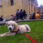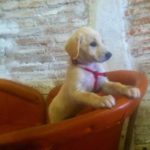 Charlotte is a gorgeous creamy yellow puppy with white markings. She had an injury to her front foot that left it without hair. She is sweet, friendly and very playful. She is doing really well in her training, and follows right along when off leash, walks nicely on leash, and has a lured sit, down, and hand target. She is now weaned, and already has a family interested in adopting her.