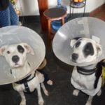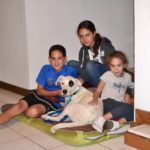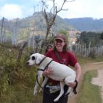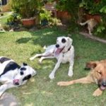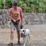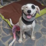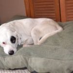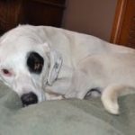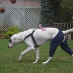 CJ had an ongoing limp. Examination showed that he had a torn ACL in his right knee, and this was repaired on March 7. He is doing great, the knee is solid, and he is is now fully healed and running strongly. When diagnosing his limp pre-surgery we had his hips x-rayed, and the radiographs show that he has mild hip dysplasia. He is a mid-energy dog and can do normal activities that an averagely active family would do, but we do recommend that he do only occasional long distance hikes and he is not a candidate to be a running buddy.