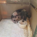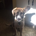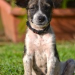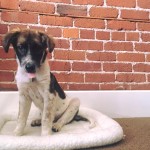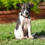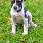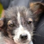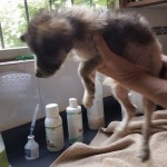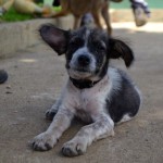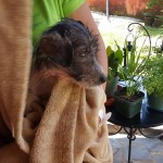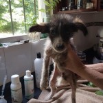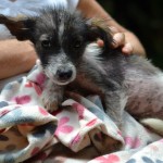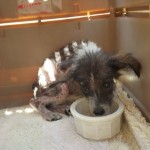 Domino weighed just 4 lbs on intake. He was about 3 months old, but was the size and weight of an 8 week old puppy. We got him bathed and dewormed, and fed him a nice warm meal. He was terribly shy and fearful for a couple of days, but quickly realized that this new place was a pretty good one, and attached himself to his caregiver.