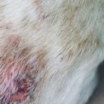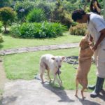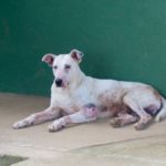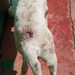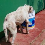 We spotted George in July on the side of the highway in the town of Santa Lucia Milpas Altas. We couldn’t stop, but this mangy, old dog with a gigantic swelling jutting from his elbow haunted us. We saw him again in August, and in early October a good samaritan sent us photos begging us to help. George was caught and taken to Vet Pro. We thought that he would likely have to be euthanized, but although he was in terrible shape, none of his problems were life-threatening. We boarded the dog at the vets for a couple of weeks, had him neutered when he was strong enough, and brought him up to the rescue on October 28th. We treated him for some of his issues. He had a medicated bath, was vaccinated, got dewormed (he has tapeworms, likely other nasties), and we treated him for fleas. We started him on antibiotics for his skin infections, too.