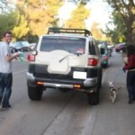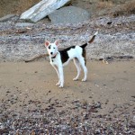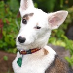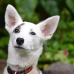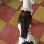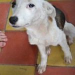 We spotted Lila (pronounced Lee-la, meaning Lilac in French…and Spanish) ) wandering near the central park in Antigua on August 15, 2013. She stood out because of her beautiful and unique markings (white with a dark brown saddle and eye patch) and because she was filthy and pathetically, skeletally thin. Her tail was plastered against her belly, her hip bones threatened to pop out through her skin, and she was trying her best to be invisible as she scrounged for food. We tried to attract her, but she was spooked by a very noisy parade, and disappeared. Disappointed that we couldn’t find her, we carried on, hoping that we would see her again and have better luck.