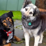 Lina would do well with older children. She would do best in a home without cats, but she loves other dogs and could live happily with a dog buddy. We don’t know her full story, but we think that Lina was kept outside in some kind of auto shop (from the black grease on her). She certainly had never been allowed inside a home or a building, and was terrified when we brought her inside. After living with her foster family and after lots of training with us, she is much better, and will generally come inside when invited. She continues to be leery of some flooring materials and needs to be coaxed in with targeting, patience, and positive reinforcement.