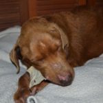 Last night we took her home from the veterinary clinic. She came home with us to have a quiet night on a soft, cushy bed. We slept beside her, stroking her soft and silky ears. She had a steak dinner and a huge bully stick (which she loved). We let her drink gallons of water, and we carried her out to pee whenever she needed it.