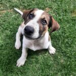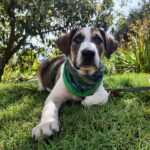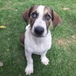We think Pepper will be on the large side, given the size of his legs and feet. He has a short coat and long tail, and a hound-like appearance.