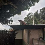 Terry and John heard the frantic barking, came out in the downpour, and managed to eventually get the terrified, traumatized pup off the roof and with some shifting, into a dry run on her own.
