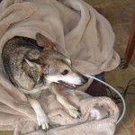 A month and a half later, Suki underwent a second, massive surgery to find the foreign bodies inside her. Indeed, she had two Zip ties in her abdomen, along with massive quantities of adhesions. She nearly died during the surgery, and was in intensive nursing care for three weeks afterward. The x-rays taken revealed that Suki had been shot prior to us finding her. Her body has many pieces of lead shot in it. The doctor removed what he could.