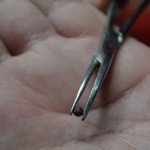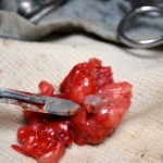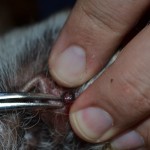 In the spring of 2014 Suki developed an abscess in her side. It finally cleared up with antibiotics, but then recurred. Our vet opened her side to try to determine the cause of the abscess, and found two channels of infected, necrotic tissue running deep inside her. We suspected that Suki had been spayed at the rescue that first had her using a technique called the McKee technique, in which the dog is opened through it’s side, the uterus is pulled out, and tied of with plastic Xip-ties. He cleaned out as much tissue as he could, and when she healed, he and to go in abdominally to see if he could find the cause.