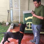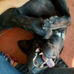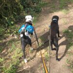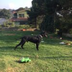 He is now connecting with people and will offer his tummy for a belly rub. He has learned that behaviors get treats and is now interested in getting treats in lower distraction, familiar settings. Webster likes to chase a ball and will sometimes return it to you. He is now walking on leash fairly well. He is very strong, and pulls and pulls hard when walked with other dogs, but does much better when on his own. We have used several types of front attach (no-pull) harnesses, but they don’t reduce his pulling that much. We have conditioned him to wear a Halti head halter, and this does work pretty well when he is being walked on his own. We have not let Webster off leash yet except in a completely fenced area.